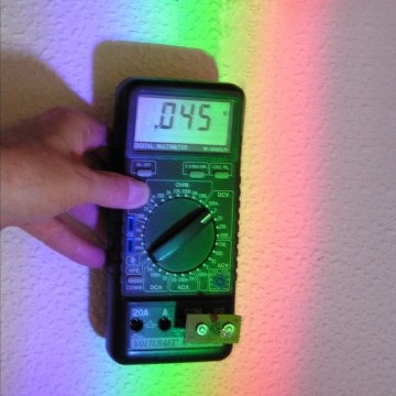 | Eine grüne LED im roten Teil des Sonnenspektrums, entworfen mit einer CD: deutlich geringere Photospannung als im grünen Teil des Sonnenspektrums. Zur Anzeige trägt auch der Grün-Anteil des Umgebungslichts bei. | Eine grüne LED im grünen Teil des Sonnenspektrums - fast ein Freihand-Versuch |